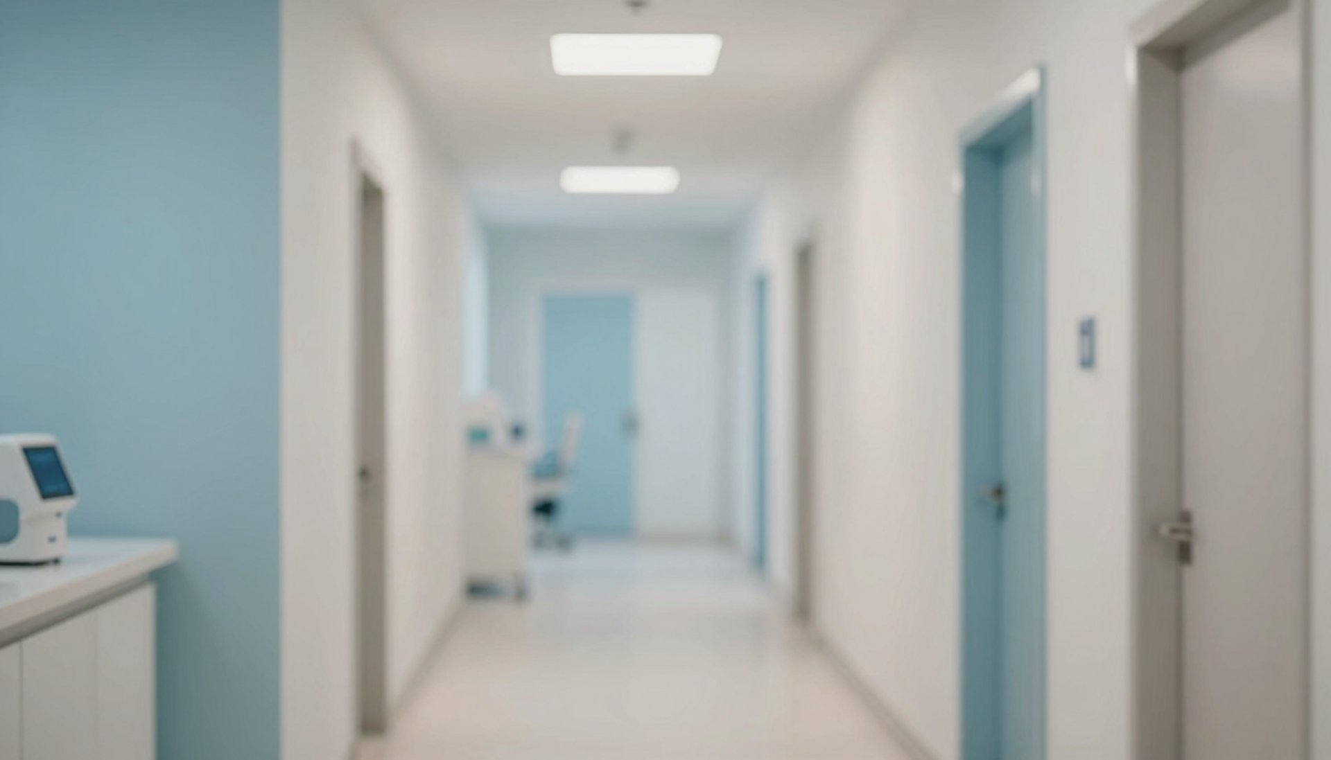 A Latin American female administrative professional at a sleek computer desk in a contemporary hospital lobby, blurred clinical background, high-end professional photography, lighting reflecting a clean medical environment.